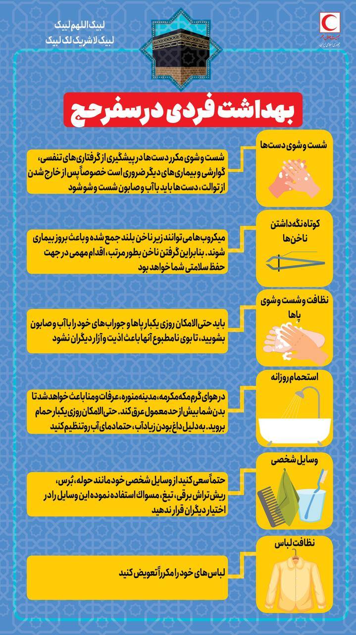 در این اینفوگرافیک با آنچه زائران درباره بهداشت فردی در سفر حج باید بدانند، آشنا شوید.