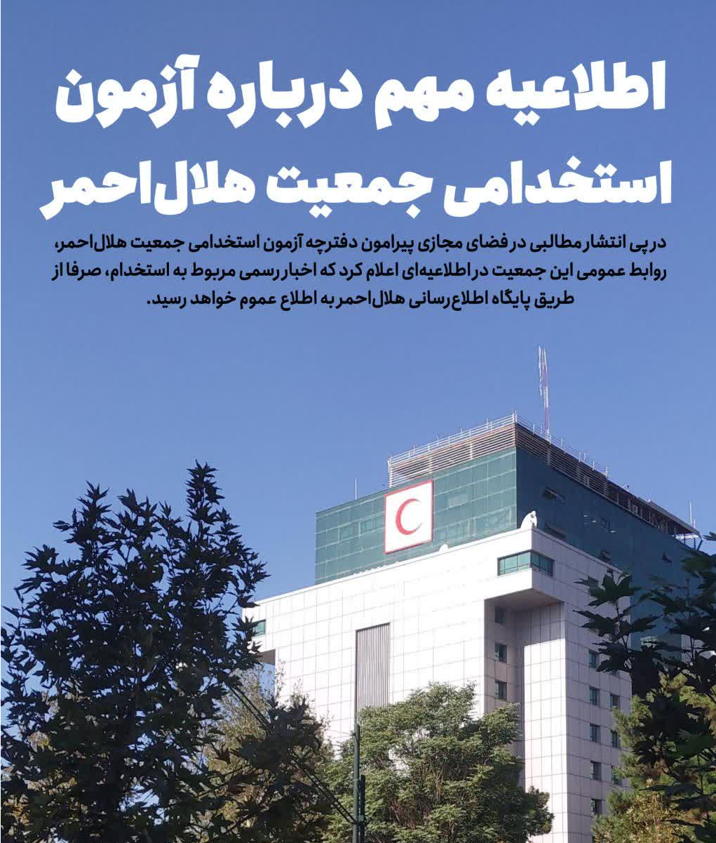 «در پی انتشار مطالبی در فضای مجازی پیرامون آزمون استخدامی جمعیت هلالاحمر و انتشار دفترچه آزمون استخدامی این جمعیت، به اطلاع شهروندان میرساند که هرگونه اخبار رسمی در خصوص برگزاری آزمون استخدامی، صرفاً از طریق پایگاه اطلاعرسانی این جمعیت به اطلاع عموم خواهد رسید.